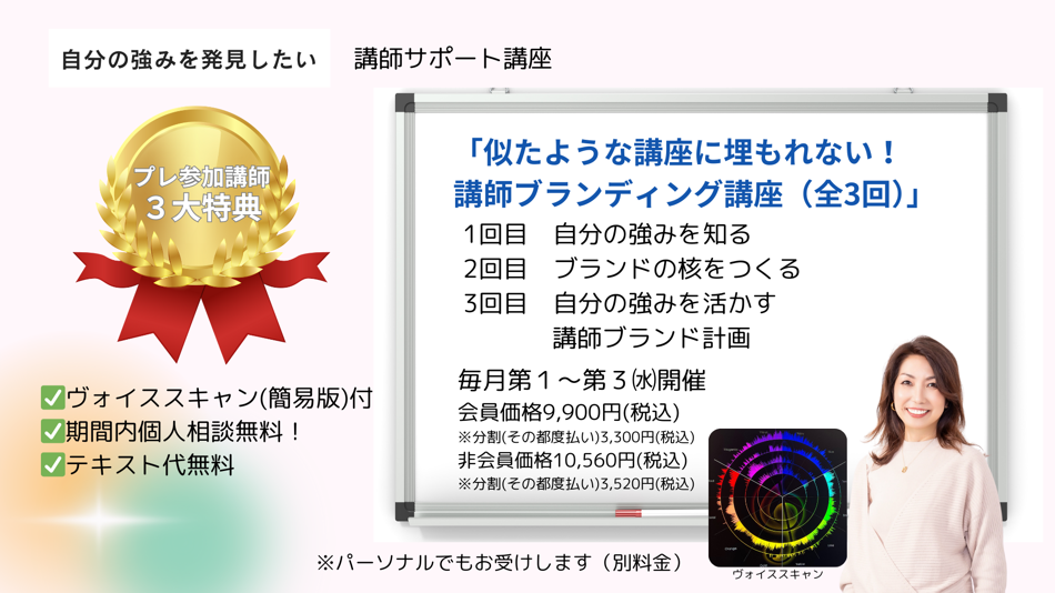 本講座〈ベーシックコース〉は、そんな課題を持つ方のために設計された 全3回完結の短期集中型プログラム です。単なる知識の習得ではなく、ワークやヴォイススキャンを通じて「あなた自身の講師ブランド」を一緒に作り上げていきます。講師としての基盤を固め、活動の第一歩を安心して踏み出すための伴走型講座です。