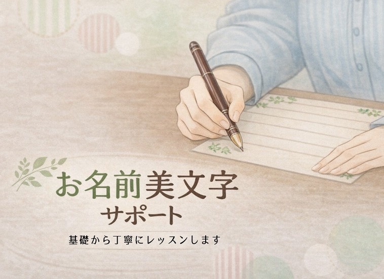 この講座は、自分のお名前を書くことが苦手な人が、文字の成り立ちと小さなコツをお伝えすることで、自信をもってあなたの納得のいく文字にするための美文字サポートレッスン講座です。