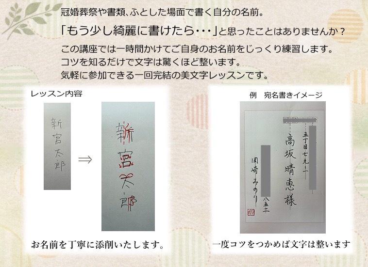 一生付き合う大切なお名前を、自信をもってあなたらしい魅力のある字で書けるようにお手伝いさせていただきます。